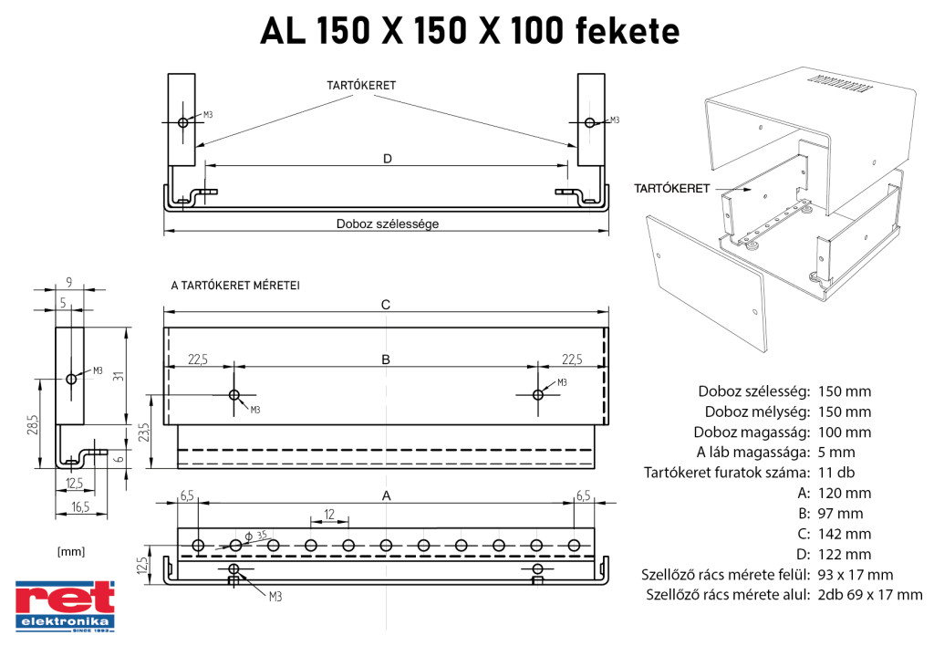 AL 150X150X100mm fekete - 150x150x100