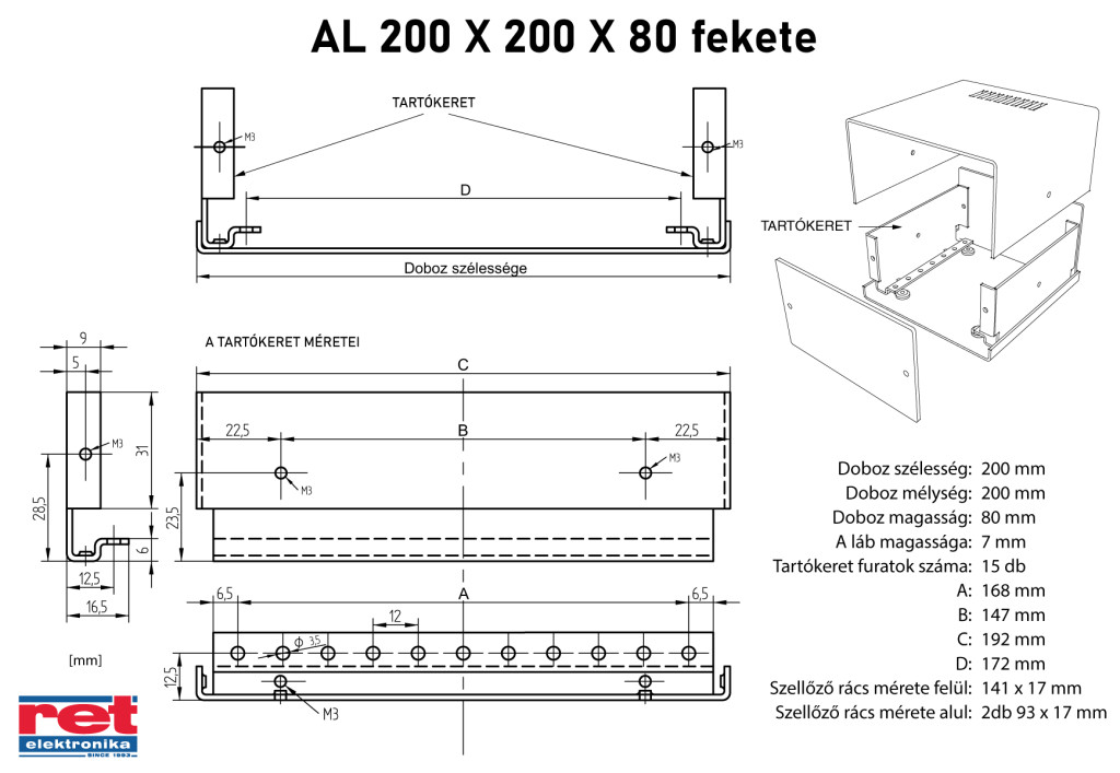 AL 200X200X80mm fekete - 200x200x80mmFekete