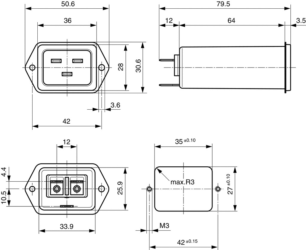 5130.0000 - csatlakozó aljzat zavarszűrővel, szerelhető 250V/16A, 2x0.6mH, 100nF+ 2x2.2nF + 1MOhm - SCHURTER